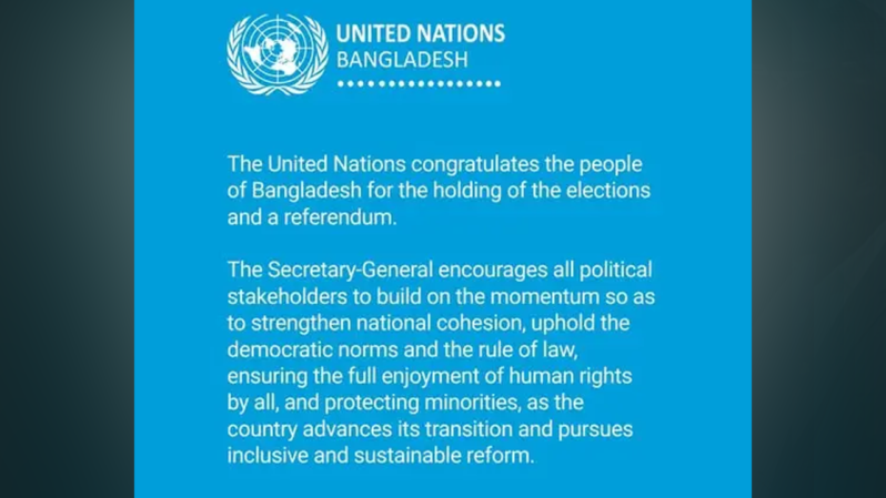 ঢাকা: নির্বাচন ও গণভোট আয়োজন উপলক্ষে বাংলাদেশের জনগণকে অভিনন্দন জানিয়েছে জাতিসংঘ। শনিবার এক বার্তায় সংস্থাটি শান্তিপূর্ণ ও সমৃদ্ধ ভবিষ্যৎ গড়ে তুলতে বাংলাদেশের পাশে থাকার প্রতিশ্রুতি পুনর্ব্যক্ত করে।