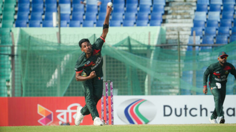 ইনিংসের সেই মুহূর্তে লেগ স্টাম্পে ফুল লেংথে করা বলটি হঠাৎই অফস্টাম্পের দিকে ভেতরে ঢুকে যায়। ব্যাট চালিয়ে প্রতিরোধের চেষ্টা করলেও বলের লাইনে পৌঁছাতে পারেননি ও’রুর্ক। ফলাফল, স্টাম্প ভেঙে ছিটকে পড়ে—স্টেডিয়ামে উচ্ছ্বাসের ঝড়।